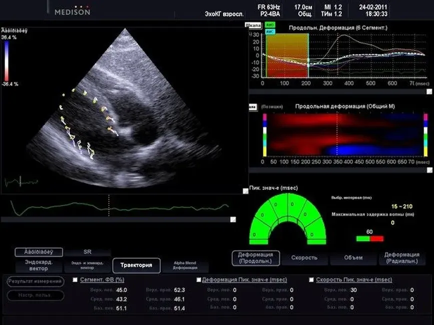 • TD-режим (тканевой допплер): количественная оценка локальной сократительной функции стенок ЛЖ и ПЖ.