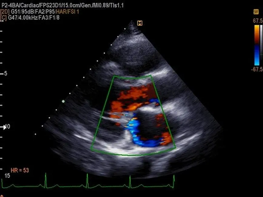 • CD-режим (ЦДК): измерение радиуса ПФСМР (PISA), полуколичественная оценка трансмитрального, транстрикуспидального, трансаортального и транспульмонального кровотока (оценка регургитации), оценка аномальных сбросов крови через МПП И МЖП.