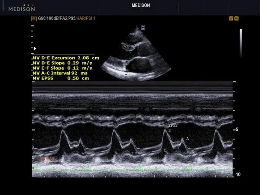 • М-режим: измерение диаметра аорты, передне-заднего размера ЛП, толщины МЖП (систолическая и диастолическая), толщины ЗСЛЖ (систолическая и диастолическая), размеров ЛЖ и ПЖ (систолический и диастолический), ФВ (Teichholz).